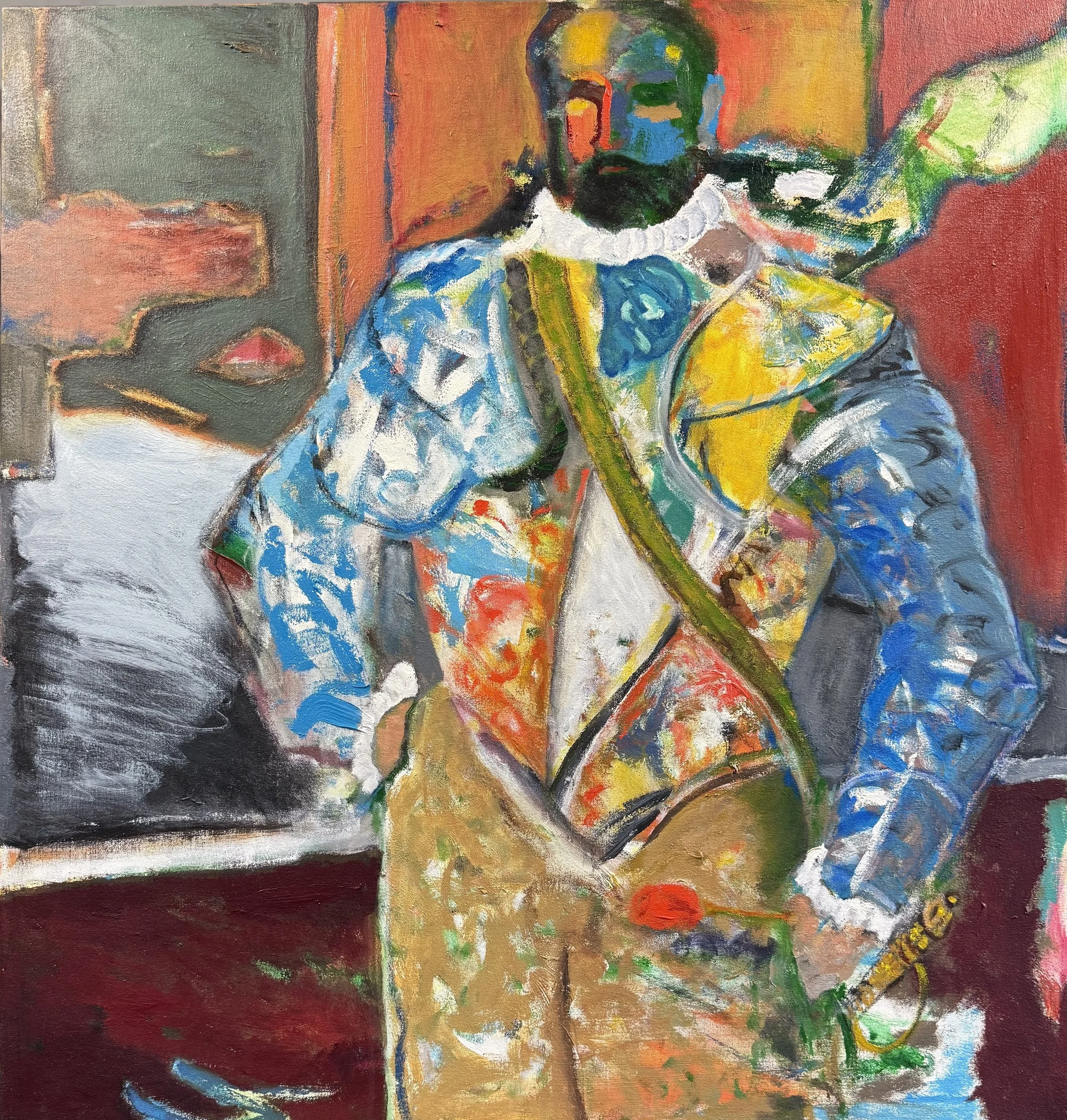 William Turner’s work is defined by bold plains of color, energetic brushwork, and a sharp sense of humor. As an artist, Turner was a careful observer and passionate student of art history, translating lessons from past masters into his own vibrant visual language. In William Turner: Conversations with the Elders, the artist took inspiration from a powerful encounter with El Greco's painting 'Vincenzo Anastagi' in the Frick Collection, New York. Entering into conversation with El Greco’s painting, Turner reimagines Anastagi in a variety of situations, some humorous, others more serious, but all alive with color and vigor.
